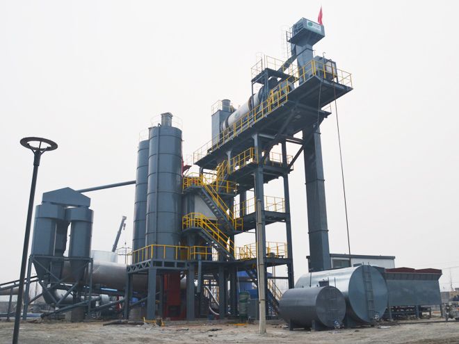 間歇固定式廠拌熱再生設備由回收料供給系統、烘干再生滾筒、熱回收料儲存倉、熱回收料稱量斗、除塵和煙氣處理系統及控制系統等組成。
